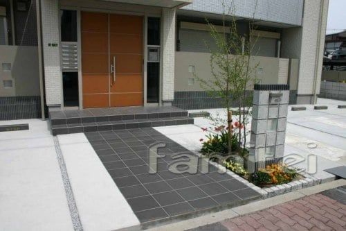 ポーチ&アプローチのタイルと綺麗にハマって、無駄のない美しい門周りですね