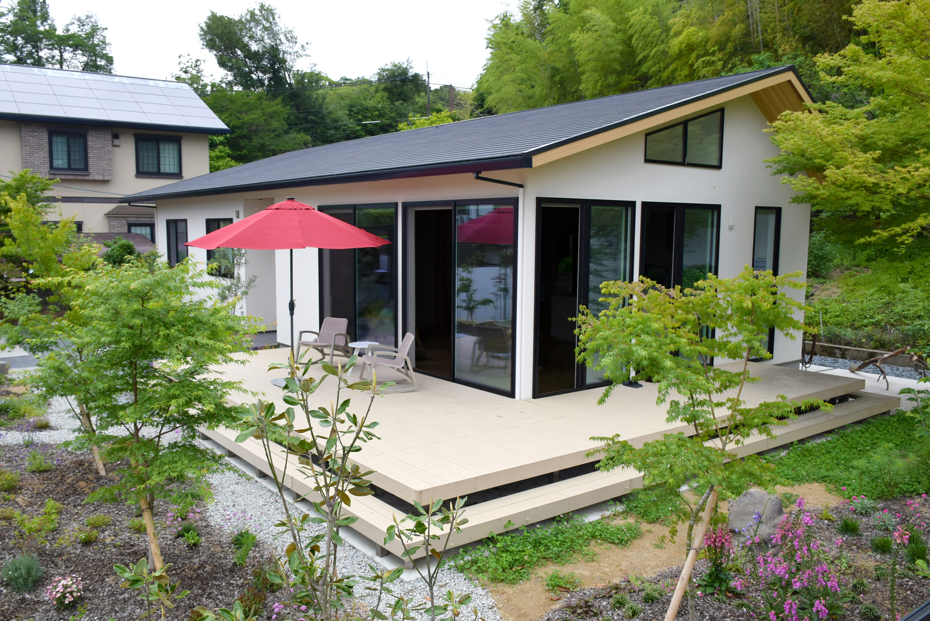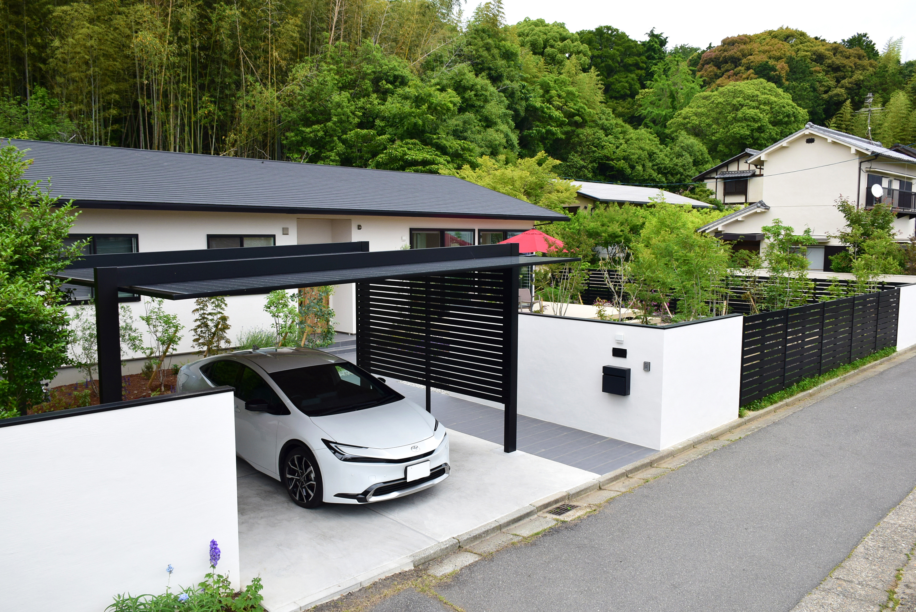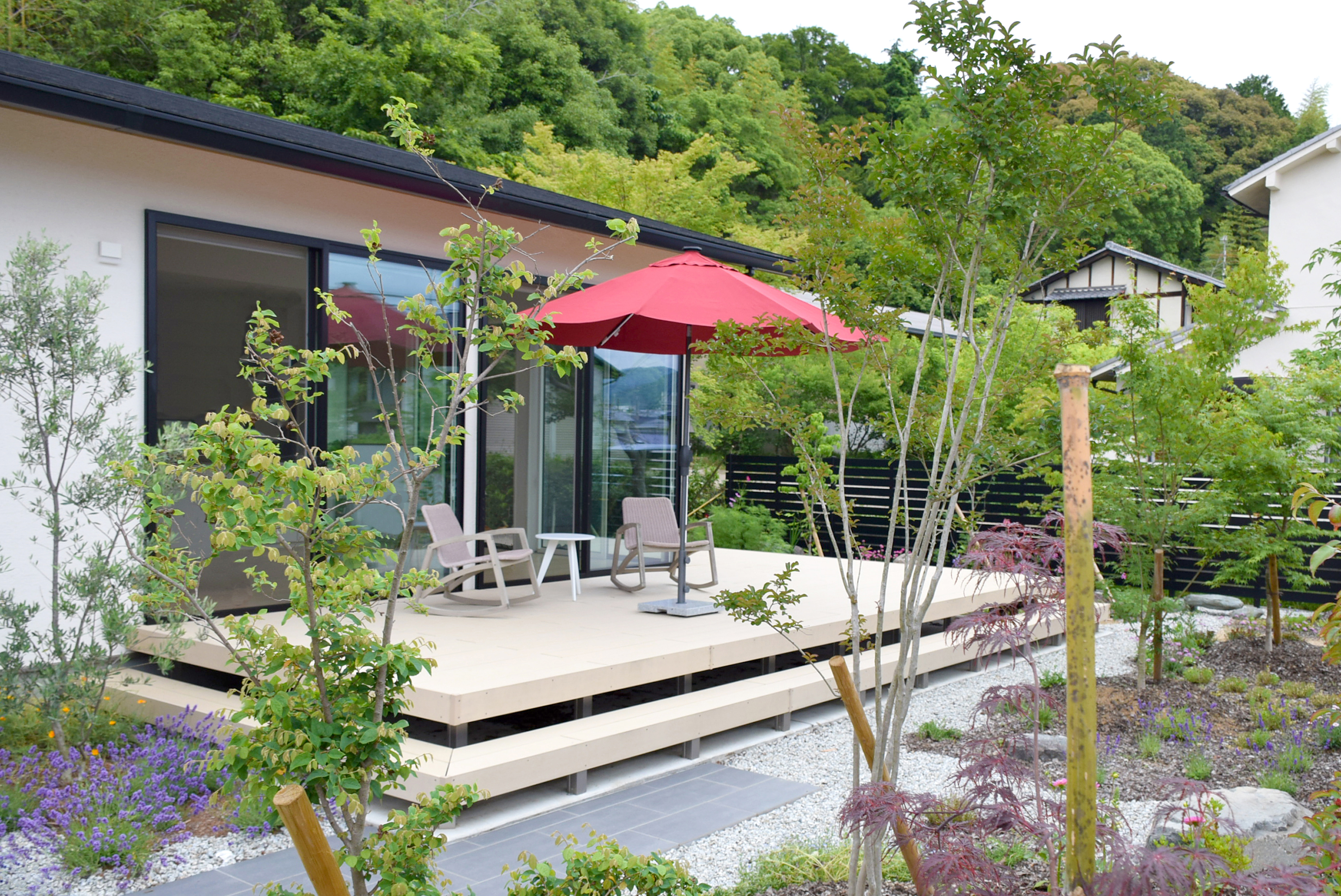 緑が生い茂り手付かずだったお庭を 植栽が映える心地いいお庭空間にリフォーム致しました。 大きな掃出し窓から広がる「樹ら楽ステージ」は 食事を楽しんだり、ゆったりとお昼寝したり、 夜には天体観測もできる極上のアウトドアリビングとしてご活用いただいております。 またガレージに設置した「カーポートSC」は、 シンプルな境界周りに違和感なくなじみながら大切なお車を守ってくれています。 日本ならではの四季の移ろいを楽しめるお庭が完成し、 お客様にもご満足いただけた作品となりました。